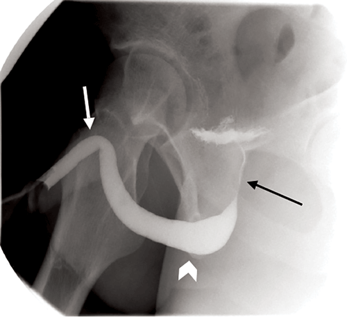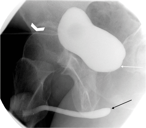 Figure 1: Normal urethrogram with good contrast opacification of the urethra and early contrast within the bladder. Penile urethra (white arrow), bulbous urethra (arrowhead) and prostatic urethra (black arrow).