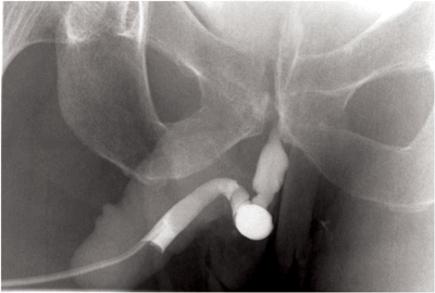 Figure 6: Oblique view of an ascending urethrogram demonstrating an abrupt