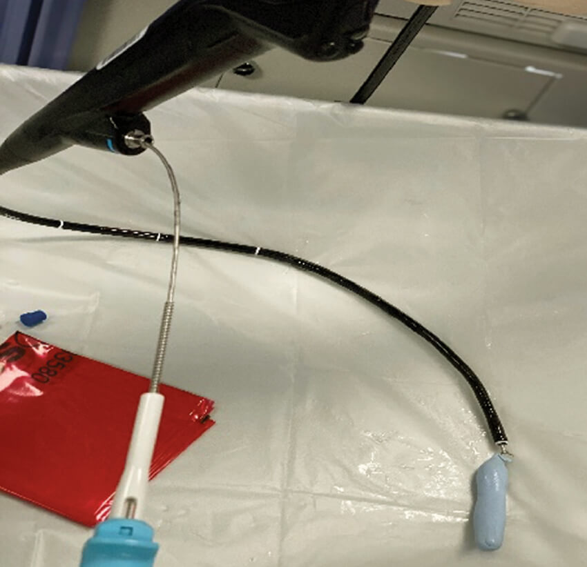 Figure 1: Blu-tack was removed using a flexible cystoscope and grasping forceps.