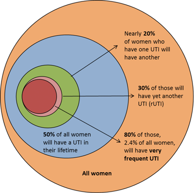 Acute uncomplicated infective cystitis is most commonly seen in healthy women with a frequency of around 0.5-0.7 episodes per woman per year [1]. Around 10% of women report having had an episode of urinary tract infection (UTI) each year and more than 50% of all women have at least one episode in their lifetime [2,3]. In contrast, men experience cystitis much less commonly [4].