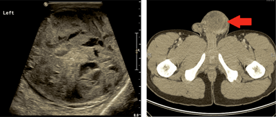 Figure 2: Ultrasound images demonstrating an enlarged left testicle with presence of heterogeneous mass which is re-demonstrated on axial cross-sections of an abdomen-pelvic CT scan in a patient with non-seminoma GCT.