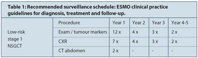 Low-risk patients are offered surveillance as a standard option unless follow-up is not possible due to lack of surveillance facilities or patient choice, in which case treatment with one or two cycles of Bleomycin, Etoposide, Cisplatin (BEP) is recommended. Overall 20% of patients will relapse, with the majority (95%) of relapses occurring over the first two years. The European Society of Medical Oncology (ESMO) surveillance schedule recommends frequent monitoring during the initial two years (Table 1).