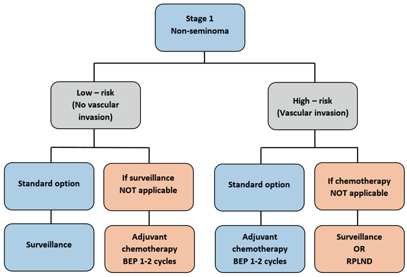 Treatment options for stage 1 non-seminoma, post-orchidectomy include surveillance, adjuvant chemotherapy and nerve sparing retroperitoneal lymph node dissection (RPLND). The presence of vascular invasion (VI) classifies patients into low-risk (VI negative) or high-risk (VI positive) groups with five-year relapse rates of 20% and 40-50%, respectively. Both groups are associated with excellent survival rates of greater than 95%.
