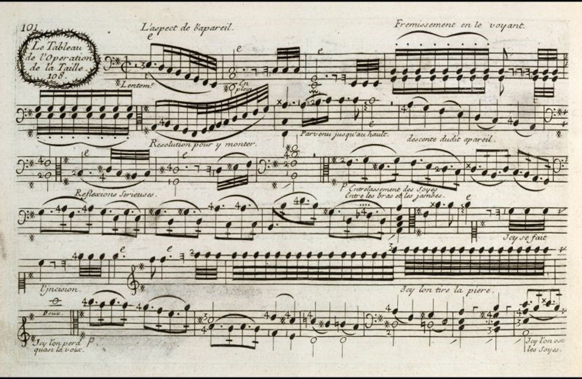 Figure 2: ‘Le tableau de l’opération de la taille’ (viol part), p.101 from Pièces de viole (5th book), Boivin, Roland Marais, Jean Louis Marais, 1725, Paris. Reproduced by permission of Archives and Special Collection, University of Melbourne, Australia.