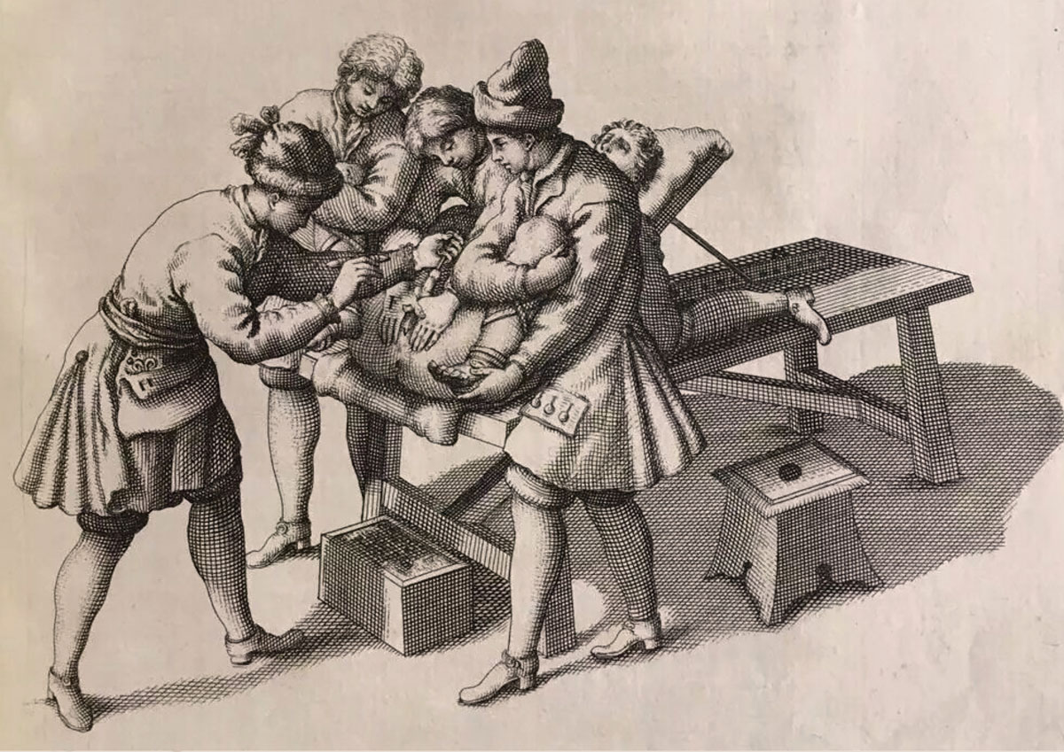 Marais wrote Le tableau de l’opération de la taille (The tableau of the operation for the stone). A tableau is a still life scene with actors or models acting out a situation or episode, often historic. I can imagine this piece of music being played in this setting, but I think Marais just meant for a musical version of one of these scenes after undergoing an operation to remove his bladder stone, without the use of anaesthetic (Figure 2).