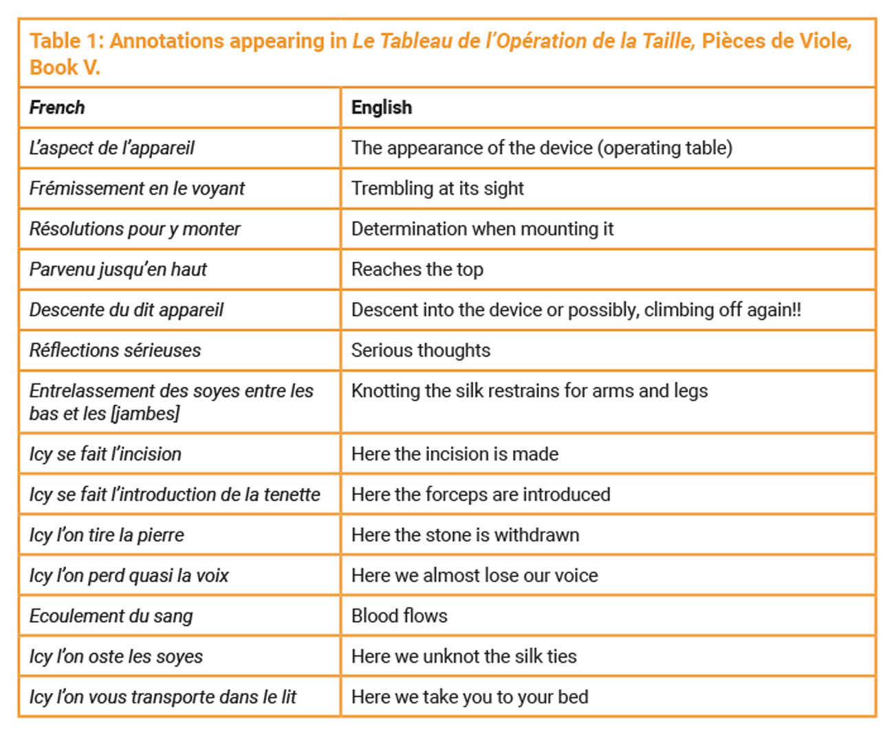 For analysis, the piece is easily divided into three sections: the preparation for the operation, the operation itself and the recovery or postoperative period. Also, within the music, Marais himself decided to actively distinguish and define the sections with descriptions. These were part of the performance, and each section was announced by a narrator during the piece (Table 1). These labels gave the audience context, describing each point in the operation. They link directly to and help to personify the experience of having the surgery, therefore telling a story, which was the composer’s whole aim. This was uncommon for this time.