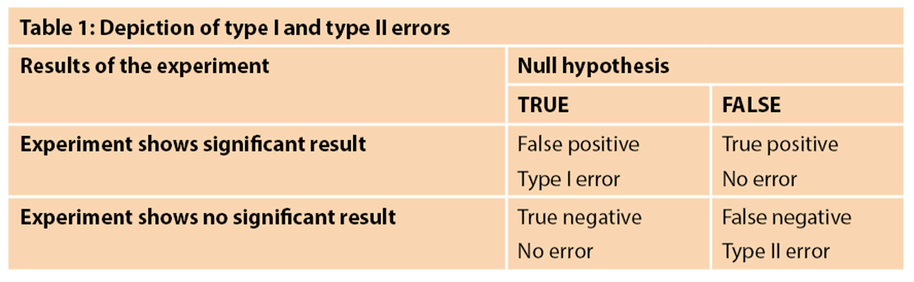 As with all statistical tests and experiments, errors are expected. The common errors related to hypothesis testing are known as type 1 and type 2 errors. A type 1 error occurs when the null hypothesis is rejected even though it is true [1,2]. This is sometimes also known as a false positive result [4]. The probability of this occurring is indicated by the significance level of the test - as explained above, the significance level of 0.05 means that there is a 5% chance that the decision to reject the null hypothesis is wrong. This is sometimes denoted as alpha (a). An example of a false positive in the clinical setting is an individual testing positive for pregnancy when they are not pregnant. A type 2 error, on the other hand, is when the null hypothesis is accepted but it is false [1]. This is also known as a false negative [4]. The probability of type 2 errors occurring is denoted as beta (ß). Type 2 errors are closely related to the statistical power of a hypothesis test; this power is defined as 1- ß. Thus, the power tells us the probability that we correctly reject the null hypothesis. Power is closely related to sample size and consequently type 2 errors tend to occur when the sample is too small. Hence, a study with a small sample size and thus low power will have a greater likelihood of a type 2 error. Typically, a power of 80% or higher is deemed appropriate for research studies and should be taken into consideration when planning a study. Table 1 depicts the circumstances under which type 1 and type 2 errors would occur [5].