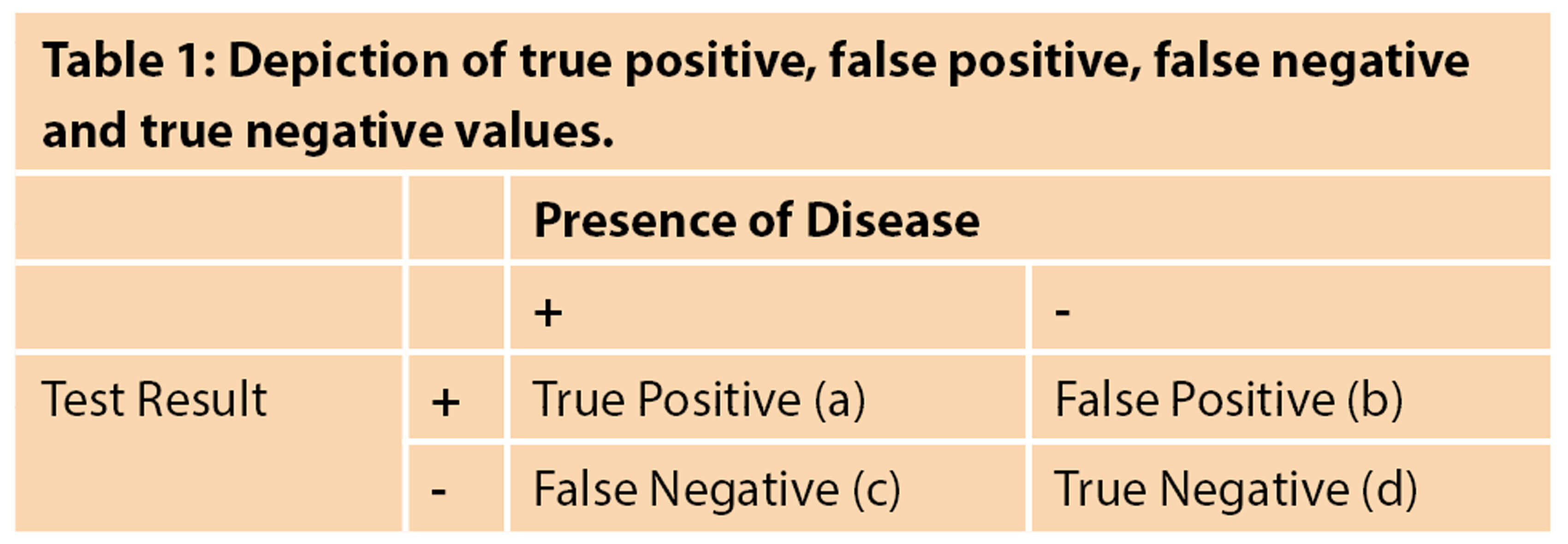 Diagnostic tests refer to any means of assessing the likelihood of a patient’s disease status including tests and investigations. Despite being key to making clinical decisions, these diagnostic tests are prone to error, which clinicians must be aware of. A diagnostic test can have two outcomes, it can be positive or negative. A perfect diagnostic test would give a positive result only when the patient has the disease and a negative result only when the patient doesn’t have the disease however diagnostic tests are not entirely accurate. When considering the accuracy of a diagnostic test, it is vital to be aware of sensitivity and specificity, as well as positive predictive value and negative predictive value. Understanding these values can determine whether a diagnostic test is appropriate to be conducted. These can be best displayed in a 2x2 table as shown in Table 1 [1].