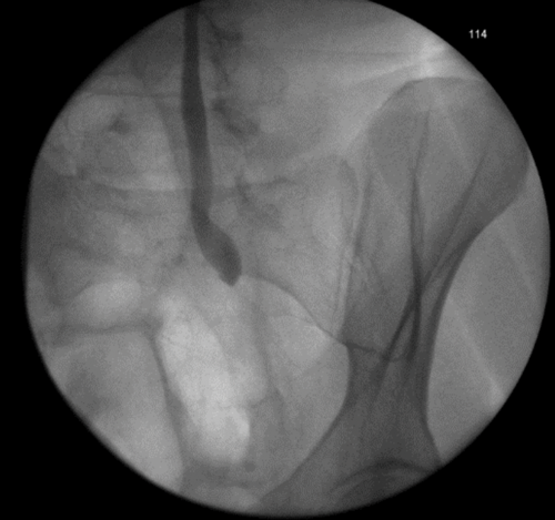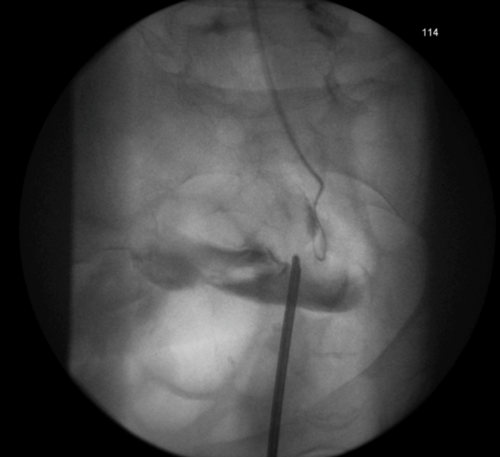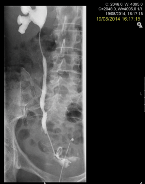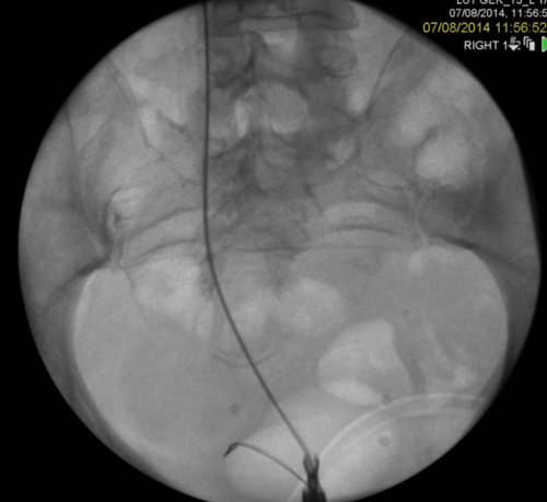 3c. Left intraoperative nephrostogram showing obliterated left distal ureter.