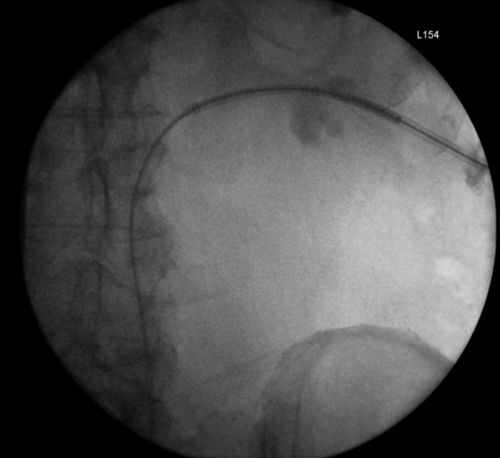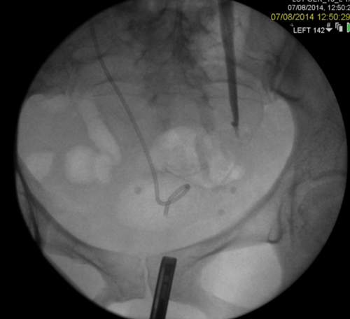 Figure 3: A 51-year-old woman, initially presenting with acute kidney injury, with bilateral distal ureteric obstruction secondary to locally advanced cervical cancer. Bilateral rendezvous, technically successful on right but failed on left secondary to ureterovaginal fistula.