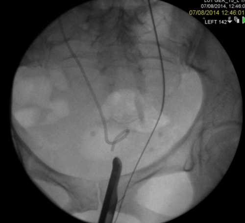 Figure 2: A Rendezvous in a patient with prostate cancer obstructing the left ureteric orifice, a partial staghorn calculus in the left kidney and left lower ureteric stones. Resection of tumour over ureteric orifice and antegrade wire.