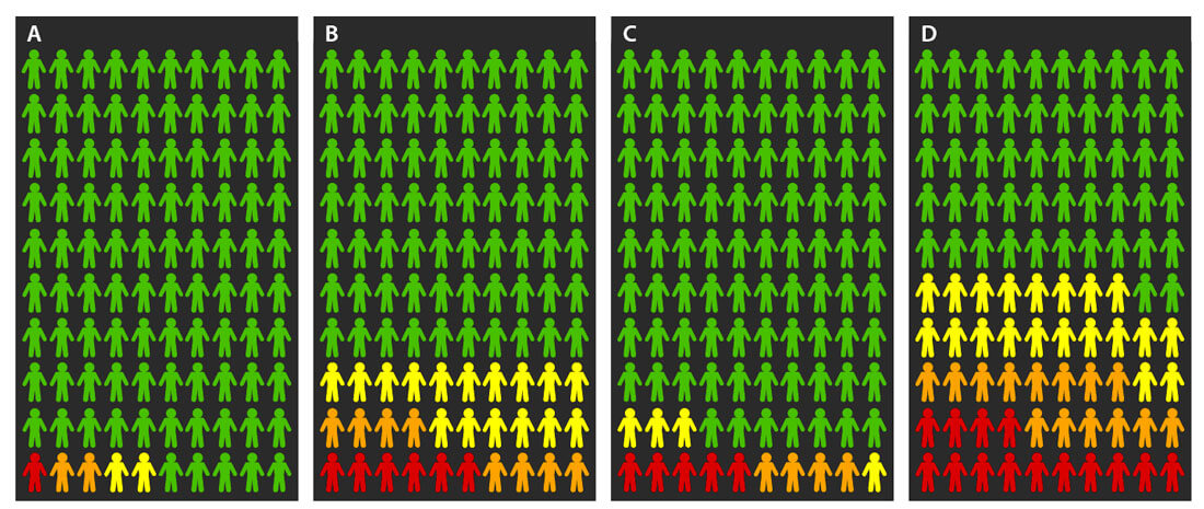Figure 1: Pictograms of the probabilities of no risk (green), low-risk (yellow), intermediate risk (orange), and high-risk, including metastatic (red) prostate cancer. A) Average population probabilities at age 65 years. B) Probabilities at age 65 years for men with a father and one brother with prostate cancer. C) Average population probabilities at age 75 years. D) Probabilities at age 75 years for men with a father and one brother with prostate cancer. Created based on data from Bratt et al. [9].