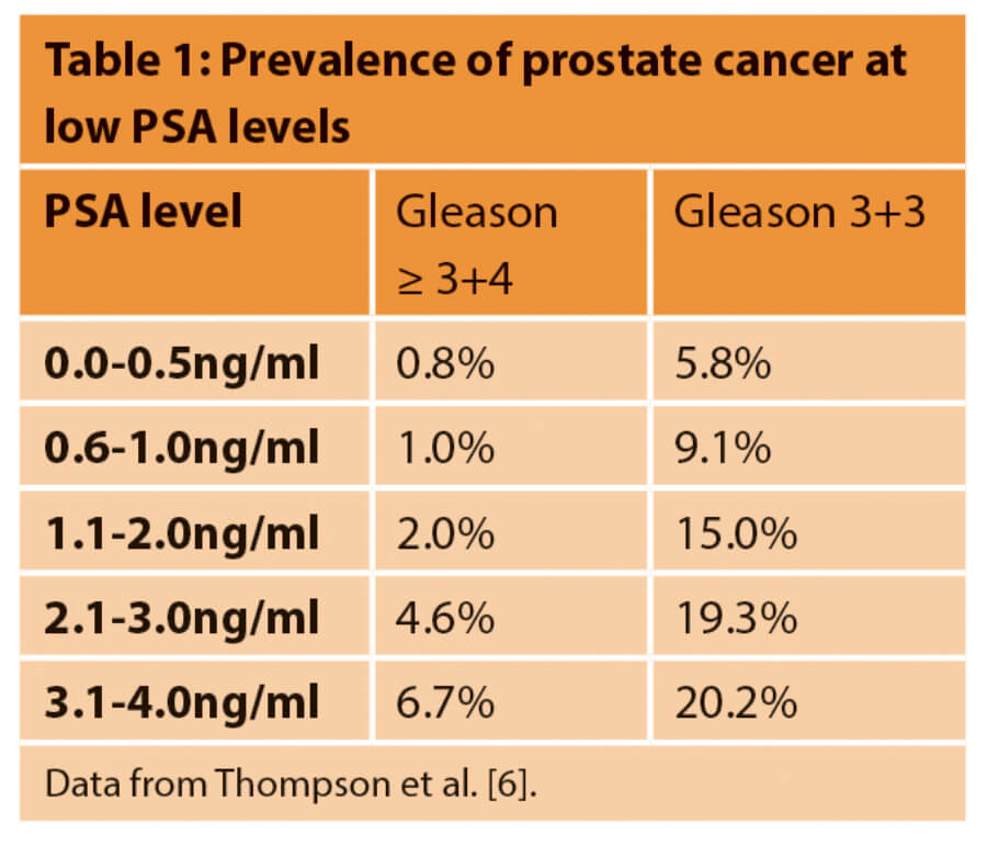 Even among men with PSA levels ≤4.0ng/ml, there is a risk of missing significant prostate cancer. In the Prostate Cancer Prevention Trial (PCPT), 2950 participants in the placebo group underwent a TRUS biopsy despite never having a PSA ≥4.0 or abnormal digital rectral examination (DRE) over the seven-year study period [6]. The results highlighted that significant prostate cancer is not rare among men with low PSA levels (Table 1). These results are based on random TRUS biopsy which has a high rate of missed diagnosis; with modern biopsy techniques using image fusion and intensive sampling from saturation or transperineal template technique it is likely that the detection of significant disease at low PSA levels would be even higher.
