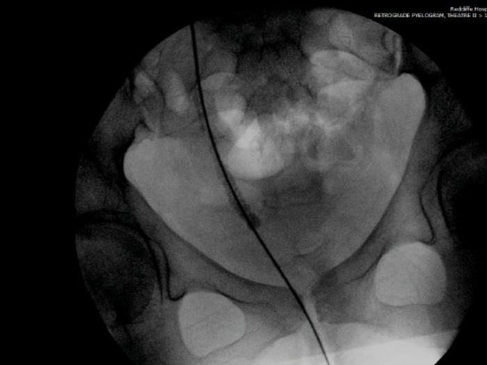- She is taken to theatre and the intraoperative fluoroscopy is shown (Figure B). What does she have?