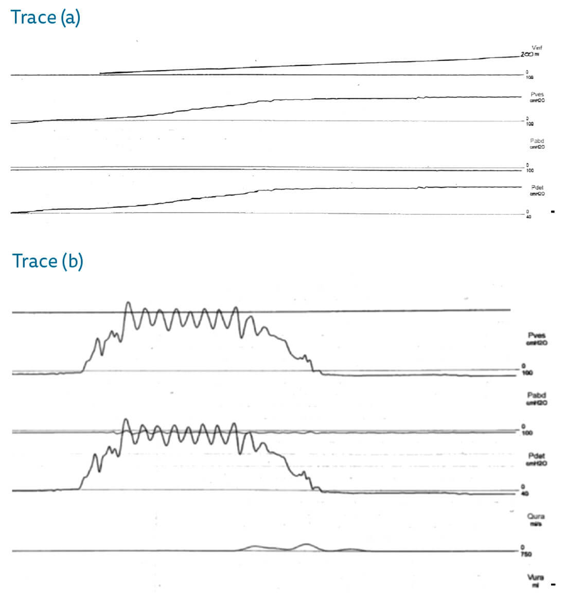 - Trace (a) shows poor bladder compliance at low volumes and (b) shows detrusor sphincter dyssynergia (discoordination between detrusor and sphincter function during voiding).
