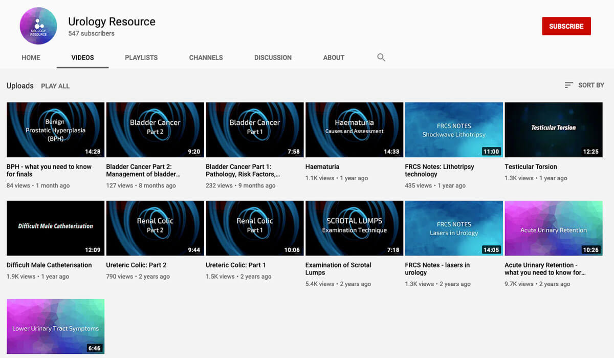 A selection of YouTube videos [5] on urology created and curated by Hari Ratan. Topics include lecture presentations on bladder cancer, haematuria, benign prostatic hyperplasia (BPH), testicular torsion, male catheterisation, lower urinary tract symptoms, scrotal lumps and acute urinary retention.