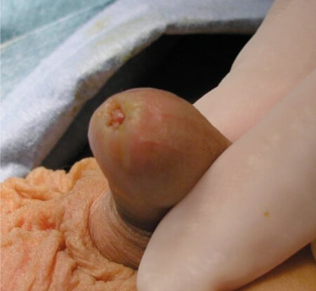 - The preputial opening is very narrow and there are adhesions between the glans and the inner prepuce. With time, the adhesions separate and the foreskin meatus loosens, to allow it to glide over the glans. The foreskin must never be forcibly retracted as this may tear the foreskin and glans.