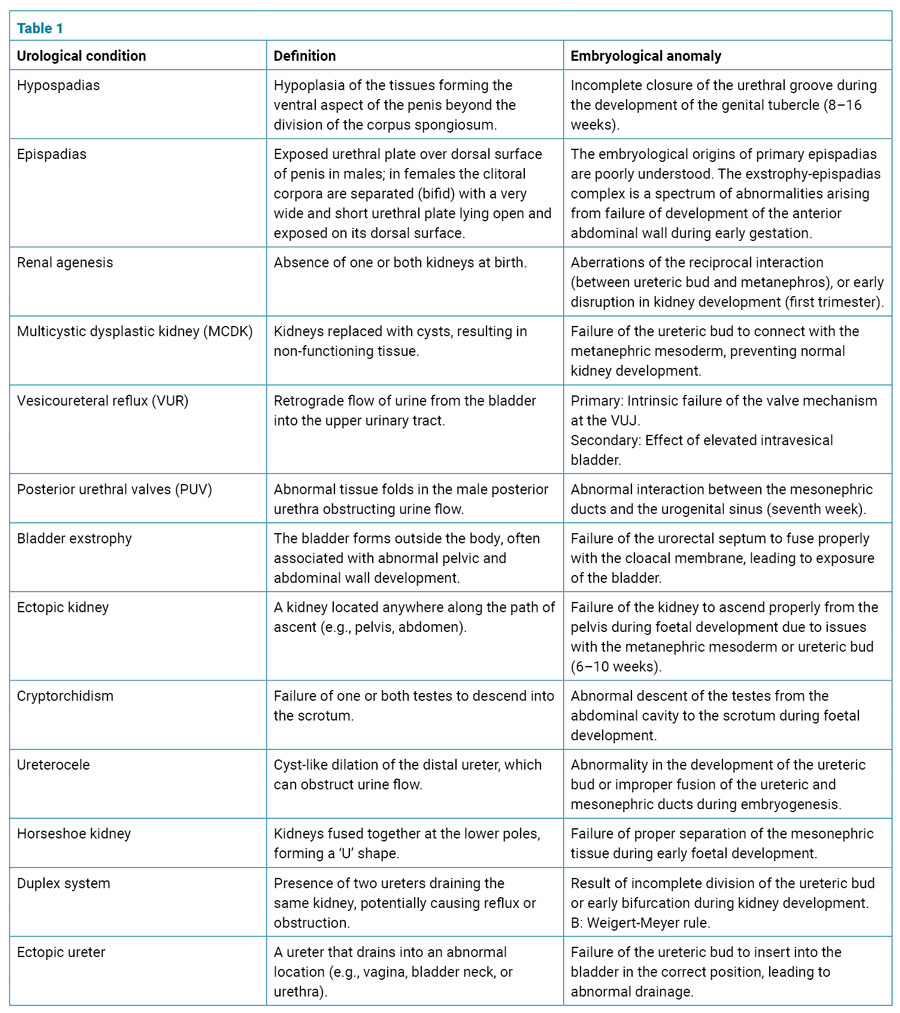 During normal foetal development, the mesonephric duct gives rise to the ureteric bud at the beginning of the fifth week of gestation. The ureteric bud, which gives rise to the ureter, calyces and collecting ducts, advances towards the caudal region of the intermediate mesoderm - the metanephros, fusing at around 32 days and commencing the process of nephrogenesis. Further details can be seen in Table 1.