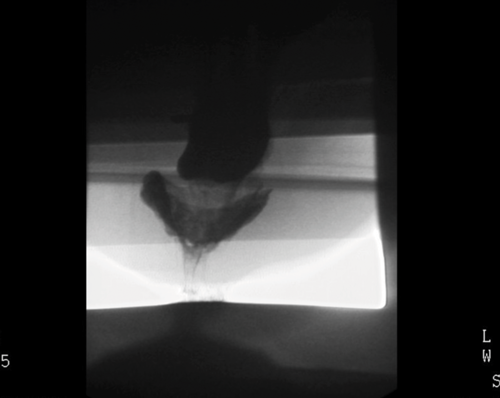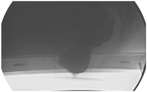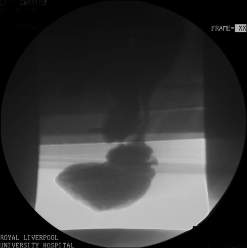 To achieve opacification of small bowel loops in fluoroscopic proctography, approximately 300ml of oral barium suspension is given 45 minutes prior to the beginning of the procedure. This is useful for the diagnosis of possible enterocoele (loops of small bowel in the pelvis). An initial digital rectal examination is performed with the patient in left lateral decubitus position in order to assess the tone of the sphincter complex and to confirm the safety of inserting a rectal tube. Approximately 200-300ml of thick barium paste is injected into the rectum via the tube. The entire examination is recorded through videofluoroscopy. Several video recorded images are obtained in left lateral and in supine positions with the patient responding to requests of ‘squeeze up’, ‘bear down’ and ‘cough’. This is to evaluate the response to increased intra-abdominal pressure. Subsequently, the patient is asked to sit on a specially designed chair and is instructed to empty the rectum completely. This part of the procedure is also video recorded and additionally spot images taken. The whole examination lasts approximately 10-15 minutes. Evaluation of the posterior compartment (rectum) with assessment pelvic floor descent is assisted by using an imaginary line drawn in the lateral views from the pubic bone anteriorly to a fixed segment of coccyx posteriorly (Figure 1).