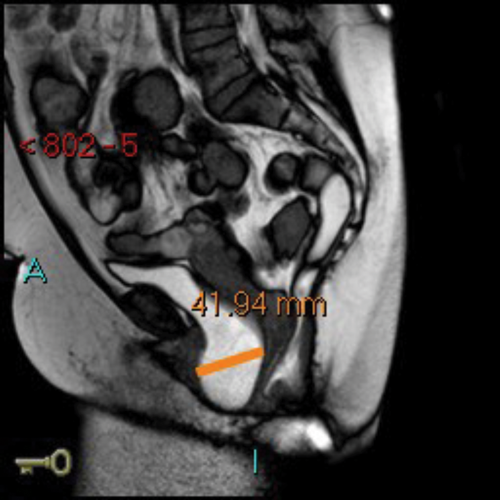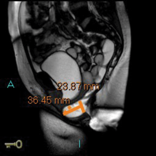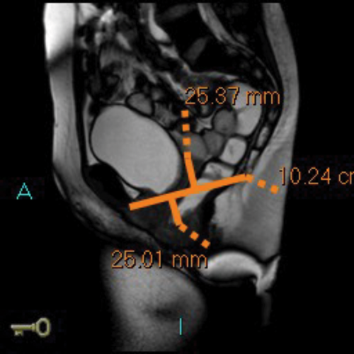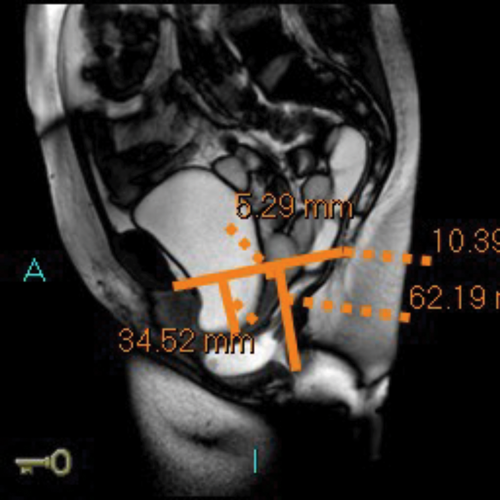 After an initial digital rectal examination, 120mls of ultrasound jelly is instilled into the rectum via a rectal tube with the patient in the left lateral position. The patient is then turned to lie supine and positioned so that the top of the Sense-body coil is at same level with the iliac crest. The MRI scan protocol includes T2 axial and coronal sequences and sagittal ‘cines’ squeeze, bear down and two defecatory attempts with a couple of minutes rest in between. In cases of incomplete evacuation, a repeat evacuation may be needed or a coronal cine.