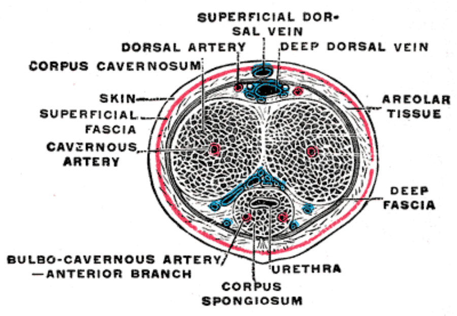 The superficial dorsal vein of the penis starts distally draining the skin of the prepuce (Figure 1). It receives numerous tributaries from the skin of the penis as it courses proximally in the midline within the subcutaneous tissue of the penis, superficial to Buck’s fascia (Figure 2). It ultimately drains into the left and right superficial external pudendal veins, a tributary of the great saphenous vein.