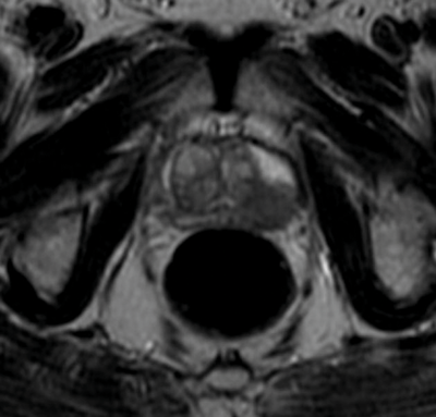 A normally fit and well 62-year-old gentleman with a PSA of 6ng/ml has this axial T2-weighted MRI. His prostate biopsies demonstrated Gleason 3+3 disease from the left lobe and digital rectal examination (DRE) revealed a firm left lobe.