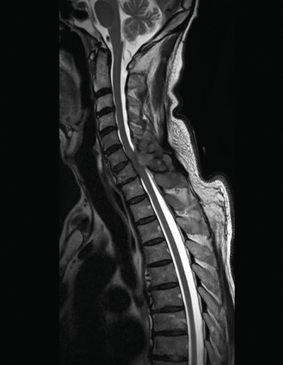 This MRI of the spine (saggital section) shows a lesion causing compression on the spinal cord at the level of C6.