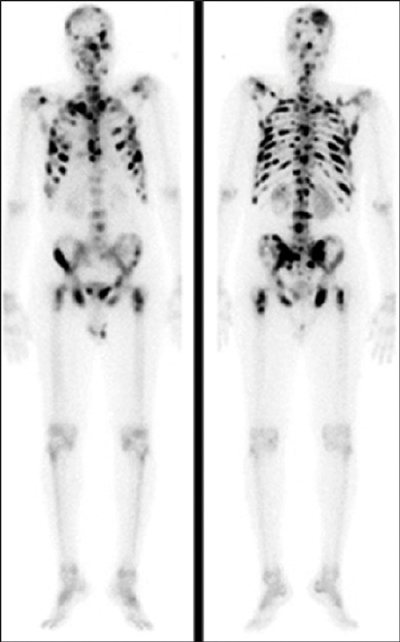 The bone scan demonstrates ‘superscan’ due to extensive osteoblastic metastasis. When there is diffuse metastasis, all of the radiotracer is concentrated in the skeleton with little or no activity in the soft tissues or urinary tract.