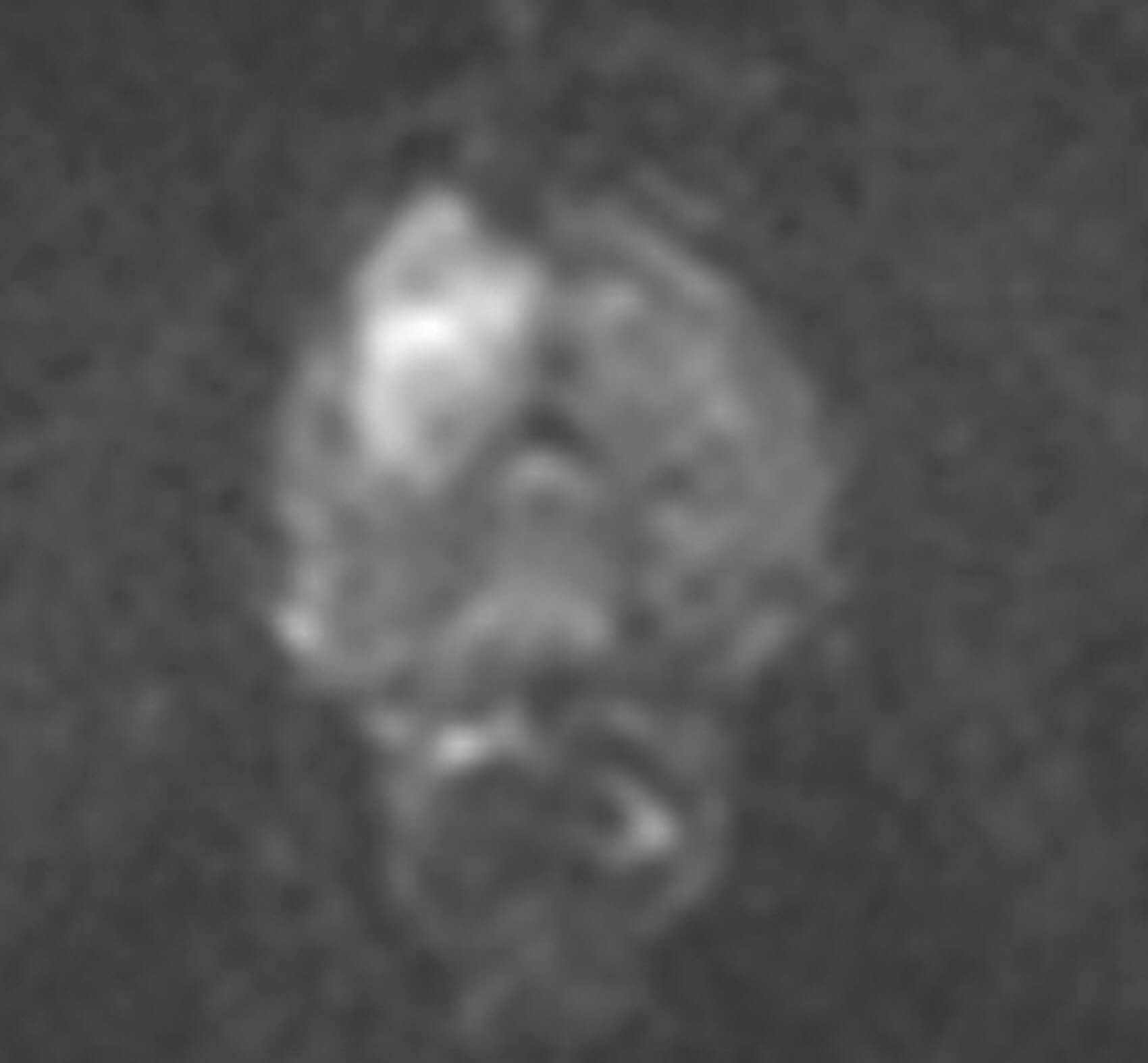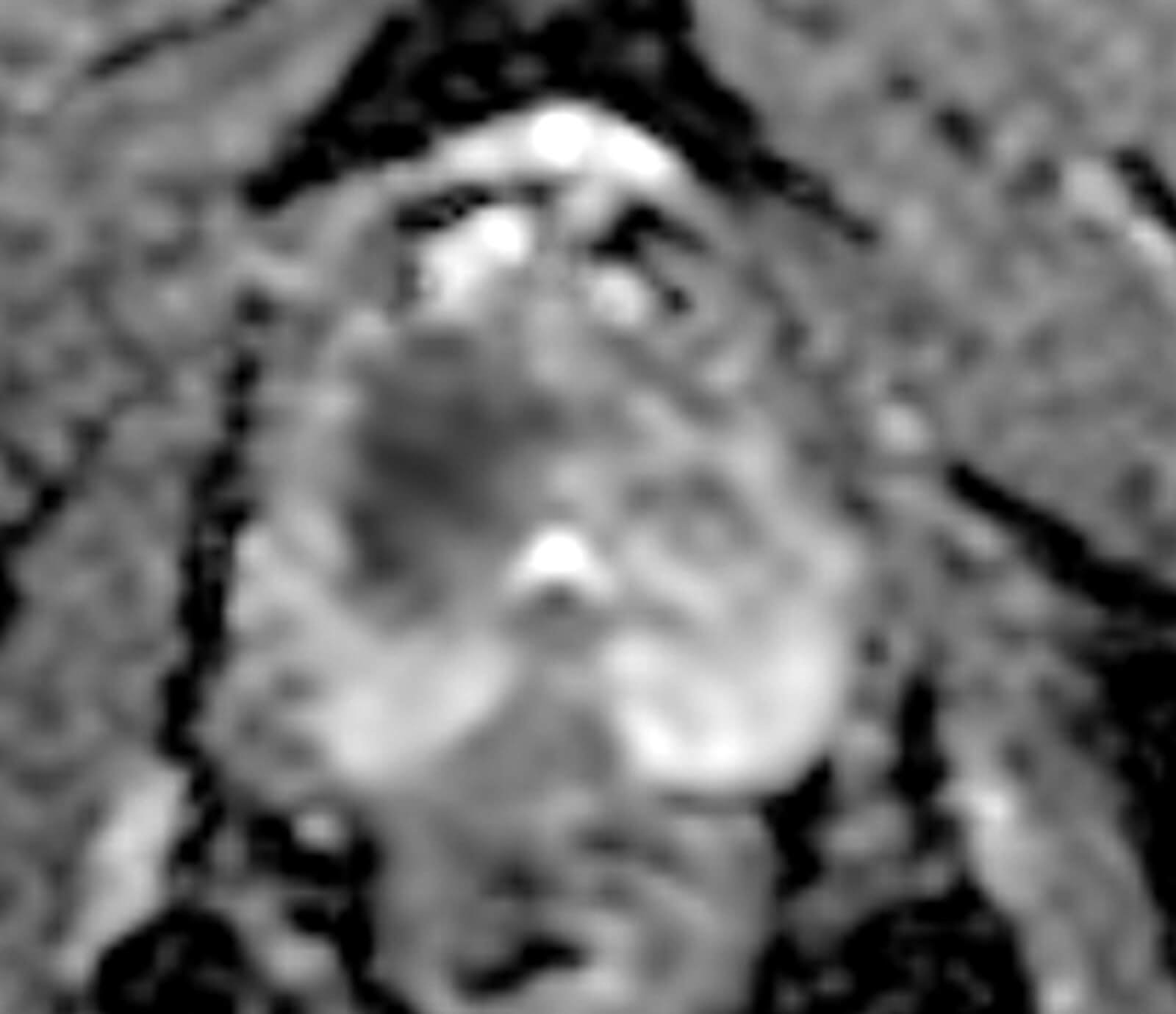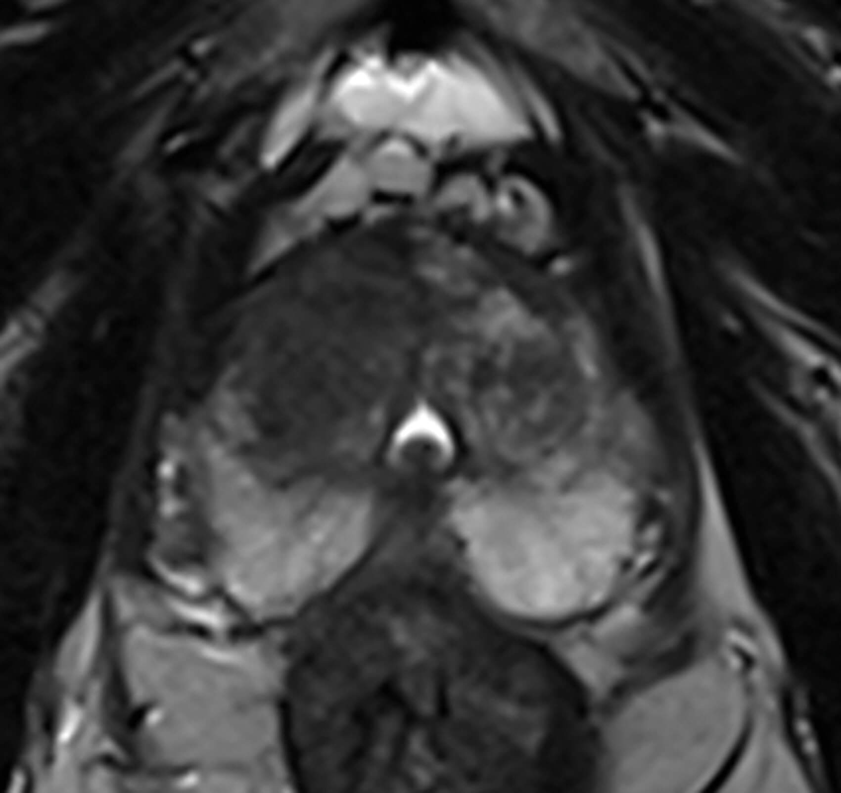 1 .Image 1 is the axial T2-weighted image of a PI-RADS 5 mid-gland lesion in the right transition zone. The lesion appears dark, measuring 19mm in diameter and would be T2bN0M0. Image 2 and image 3 is the same lesion demonstrated on the high b value (b1400) Diffusion weighted image (DWI) and the apparent diffusion coefficient (ADC) map respectively. Image 4 shows the same lesion with increased contrast uptake on the early dynamic contrast enhanced sequence (although contrast has limited role in the evaluation of the transition zone) [1].