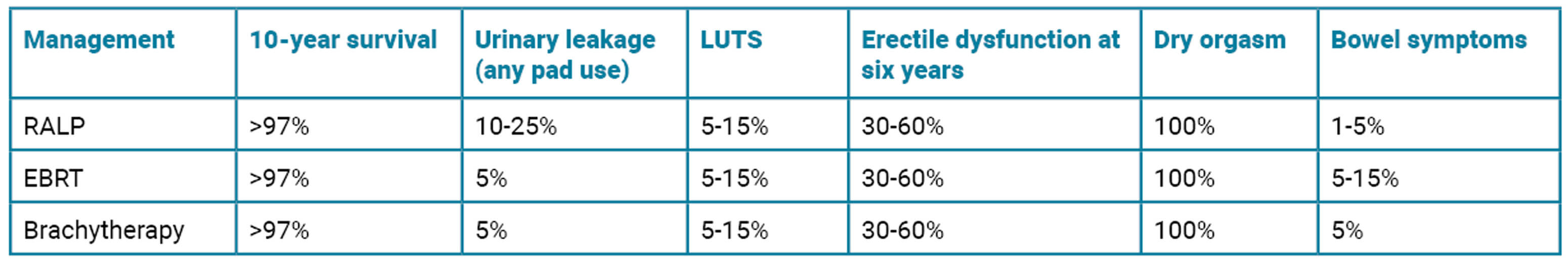 4. When counselling a patient on radical treatment options it is important to explain the risks and recovery afterwards, in addition to fertility, sexual function, continence and lower urinary tract symptoms. The risks are summarised in the below table (PROTECT [4], CHIPP trial [5] and UK National Prostate cancer audit). RALP also has associated risks of anastomotic leak, stricture and bladder neck stenosis. RALP and brachytherapy have associated GA risks. Radiation cystitis can occur many years later.