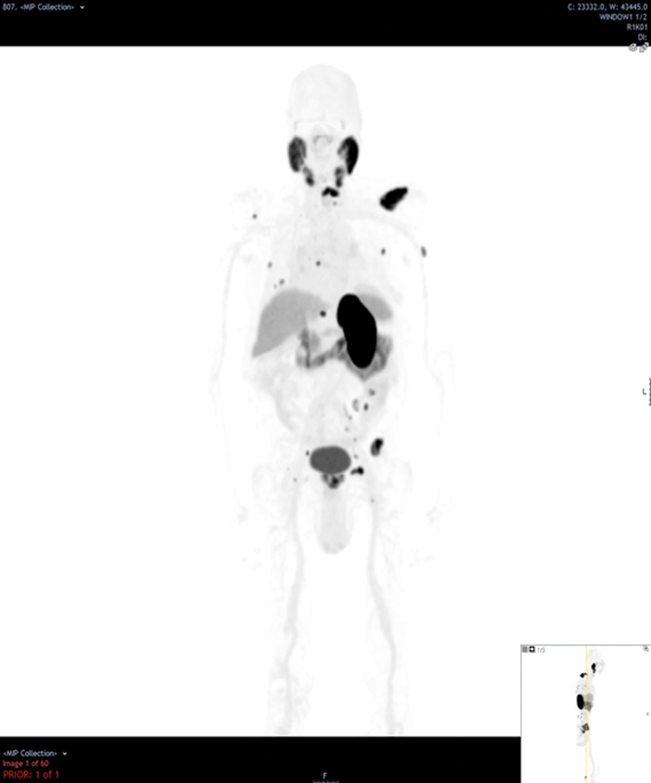 4. This is a prostate-specific membrane antigen-positron emission tomography (PSMA-PET) scan. Figure 2 is a maximum intensity projection (MIP) image showing PSMA uptake in the prostate, internal iliac lymph nodes and skeletal metastases. Figure 3 is an axial fused PET-CT image demonstrating uptake in the left seminal vesicle, a left internal iliac lymph node and the left superior pubic ramus.
