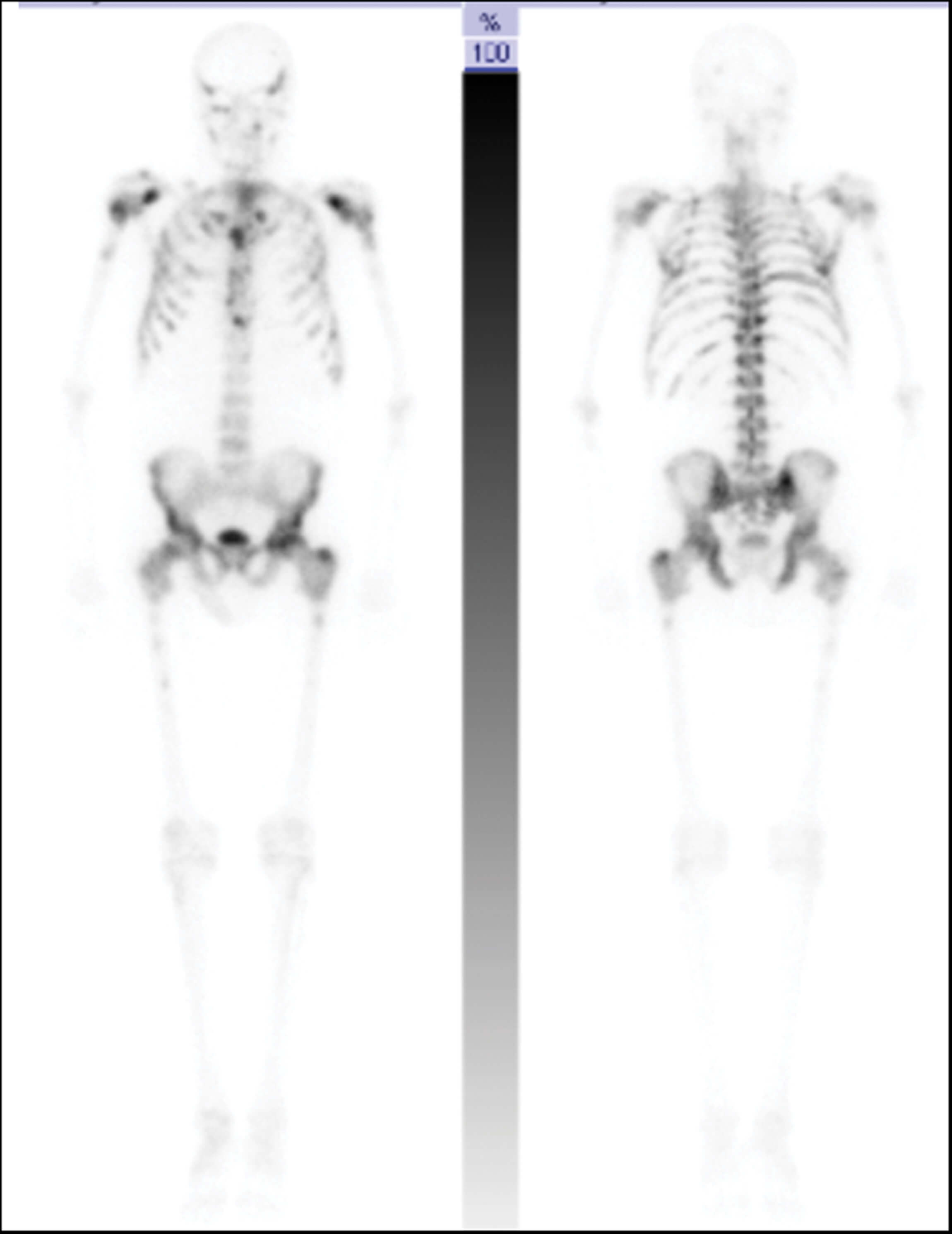 2. This is an isotope whole body bone scan which uses Technetium-99 (99mTc) tracer to demonstrate high bone activity such as in bone metastases. For the patient in this case, there are several areas of increased tracer uptake throughout the skeleton corresponding to extensive bone metastases. There is no tracer uptake in the kidneys, a finding known as ‘Super Scan’, due to the extensive osteoblastic metastases causing diminished renal and background soft tissue uptake. Bone scans are indicated in prostate cancer for patients who are CPG3 and above, any concern for bony metastases and patients on watchful waiting with a high risk of bony metastases [2]. The reported sensitivity is 79% and specificity is 82% [3].
