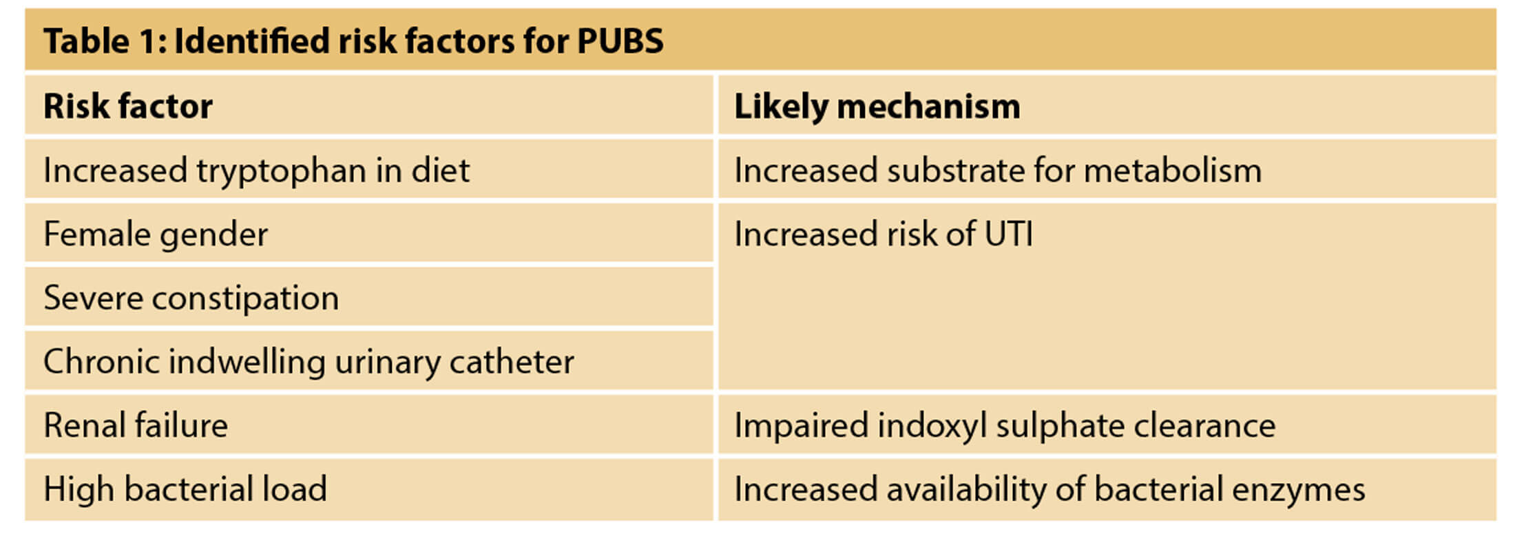 Identified risk factors implicated are in Table 1. Much of this is evidenced from case reports. Increased intake of tryptophan in the diet increases the substrate for PUBS-causing bacteria and alkalinised urine facilitates the oxidation of indoxyl sulphate although the latter may not always be a requirement as evidenced by a case report of PUBS in acidic urine [6]. Elderly individuals with multiple co-morbidities are more likely to be catheterised long-term, which increases their risk of urinary infection, with an added inherent risk from female urinary anatomy. Chronic renal failure and haemodialysis [7], nephrostomy tubes and ileal conduits have been associated from case reports [8]. Severe constipation may predispose to urinary retention as well as increase faecal bacterial load. Long-term catheters are well known to increase the risk of UTI, but PUBS seem to be more common in those in whom polyvinylchloride (PVC) catheters have been used [9].