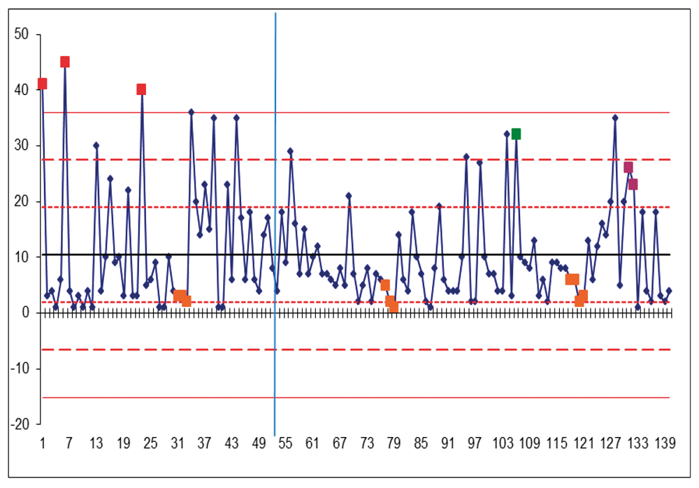 Figure 2: Statistical process chart of length of stay for the first nine months of the project. Each patient and their LOS is represented by a dot and are plotted in order of time. One and two standard deviations from the mean are shown with horizontal red lines. The vertical blue line represents initiation of MDT and frailty criteria.