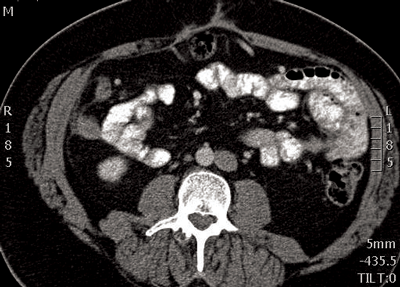 Figure 2: 3D reconstruction of a CTA showing two left renal arteries and three right renal arteries.