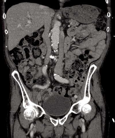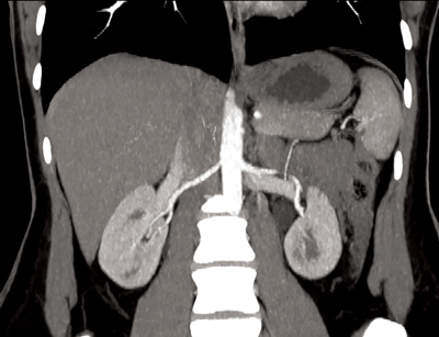 Figure 1: Coronal CTA demonstrating single renal artery supplying