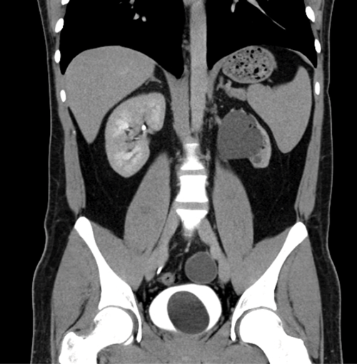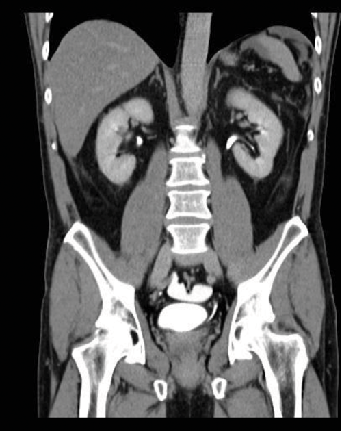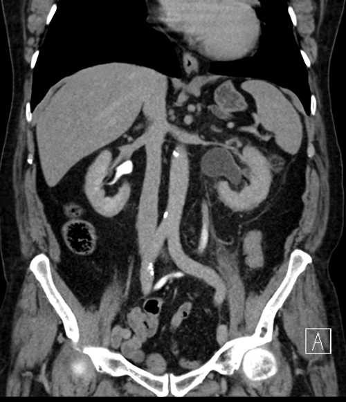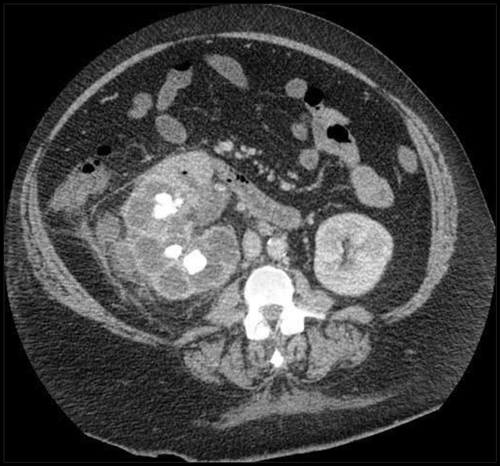 A 42-year-old male presented with sepsis, fatigue and abdominal pain. He had a previous history of renal calculi. A contrast CT was performed to ascertain the cause of the pain.