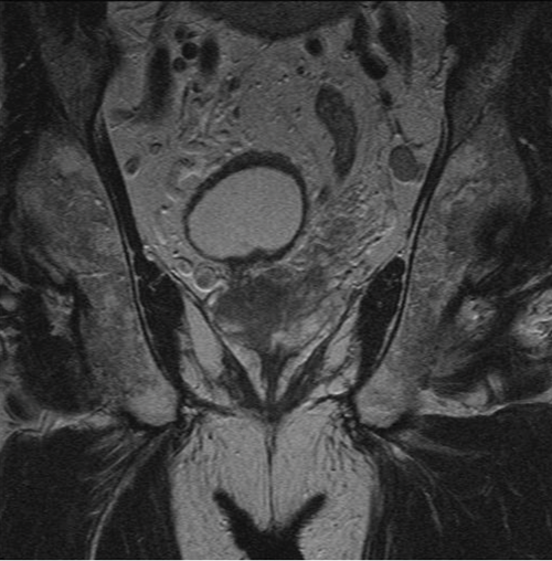 - Coronal, T2-weighted MRI. Fluid is bright on T2 and dark on T1 MRI. The bladder can clearly be seen on this image and is bright.