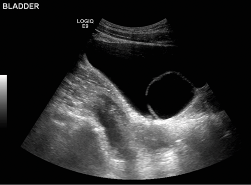 - There is a well-defined, curvilinear structure seen within the urinary bladder, which contains fluid.
