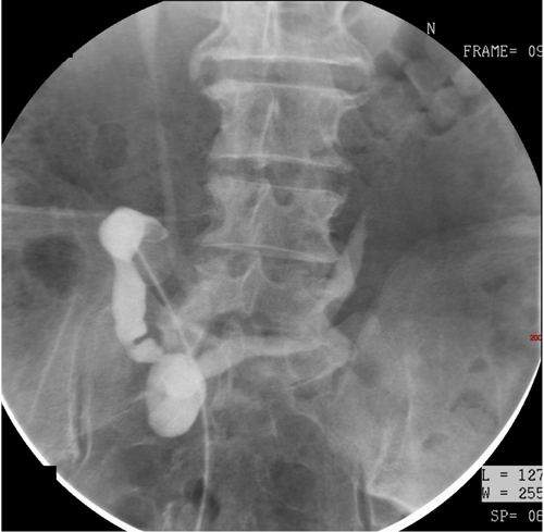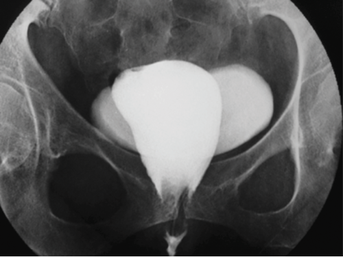 - Contrast is seen to opacify the urinary bladder as well as another structure which has a more longitudinal appearance on the image.