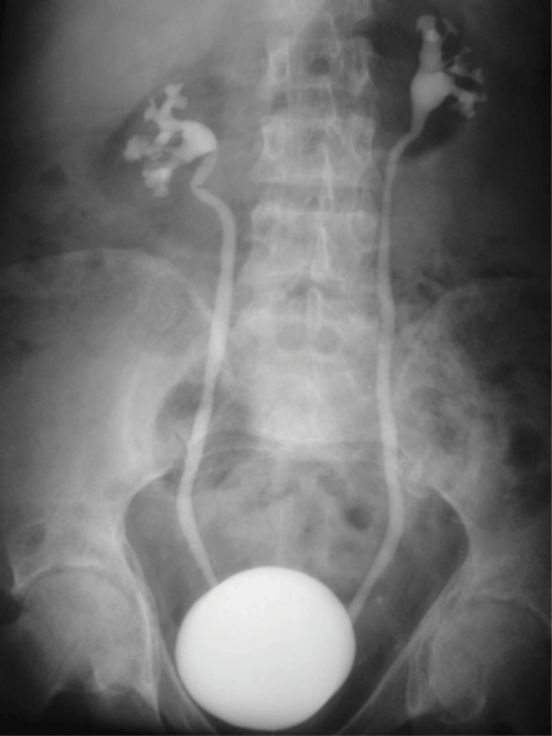 - A cystogram has been performed. Although the image looks like an intravenous urogram (IVU), the bladder is too densely opacified with contrast for this to be part of an IVU series. The bladder has been distended with contrast during the cystogram.