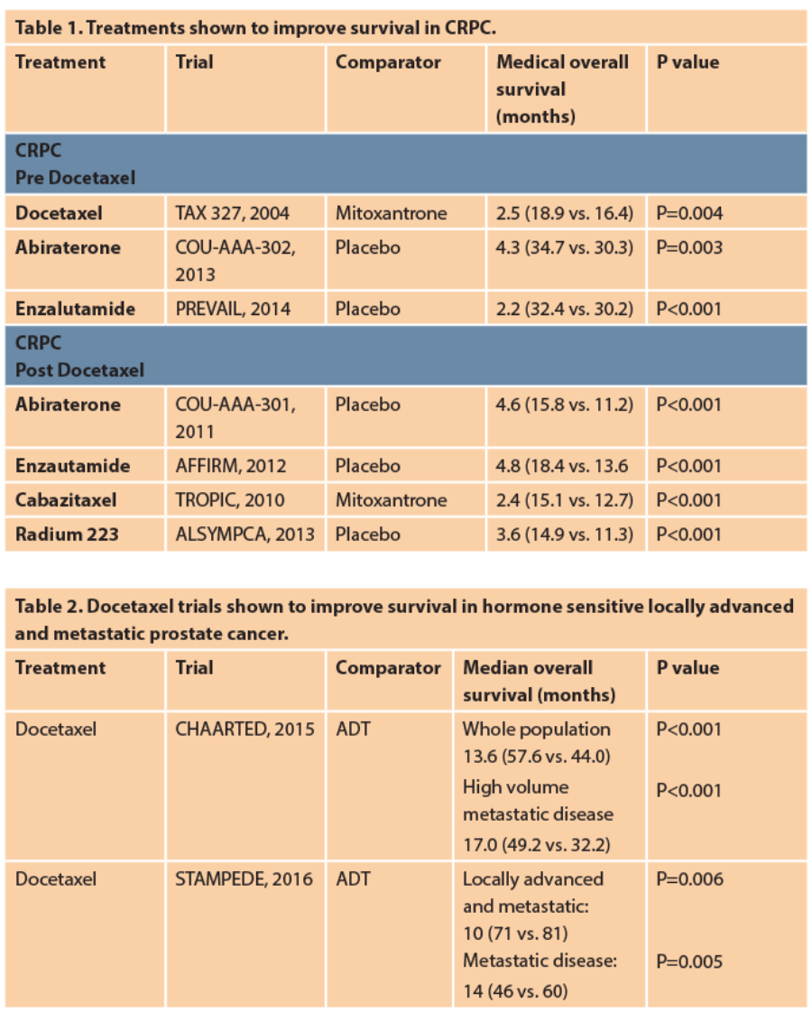 In 2004, docetaxel became the first treatment to show a survival benefit and emerged as standard of care in CRPC [1]. However new therapeutic options have expanded rapidly since 2011 including second-line chemotherapy, second generation hormonal targeted therapy and bone seeking radionuclides. In addition, bisphosphonates and denosumab have decreased skeletal related adverse events, whilst improving quality of life.