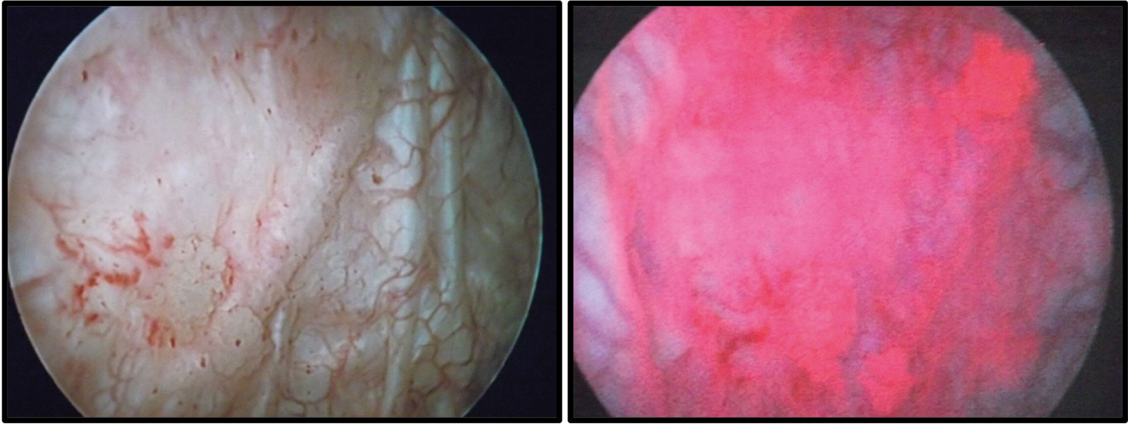 Figure 2: Cystoscopy of a patient diagnosed with CIS. The right shows the red appearance of CIS with PDD,