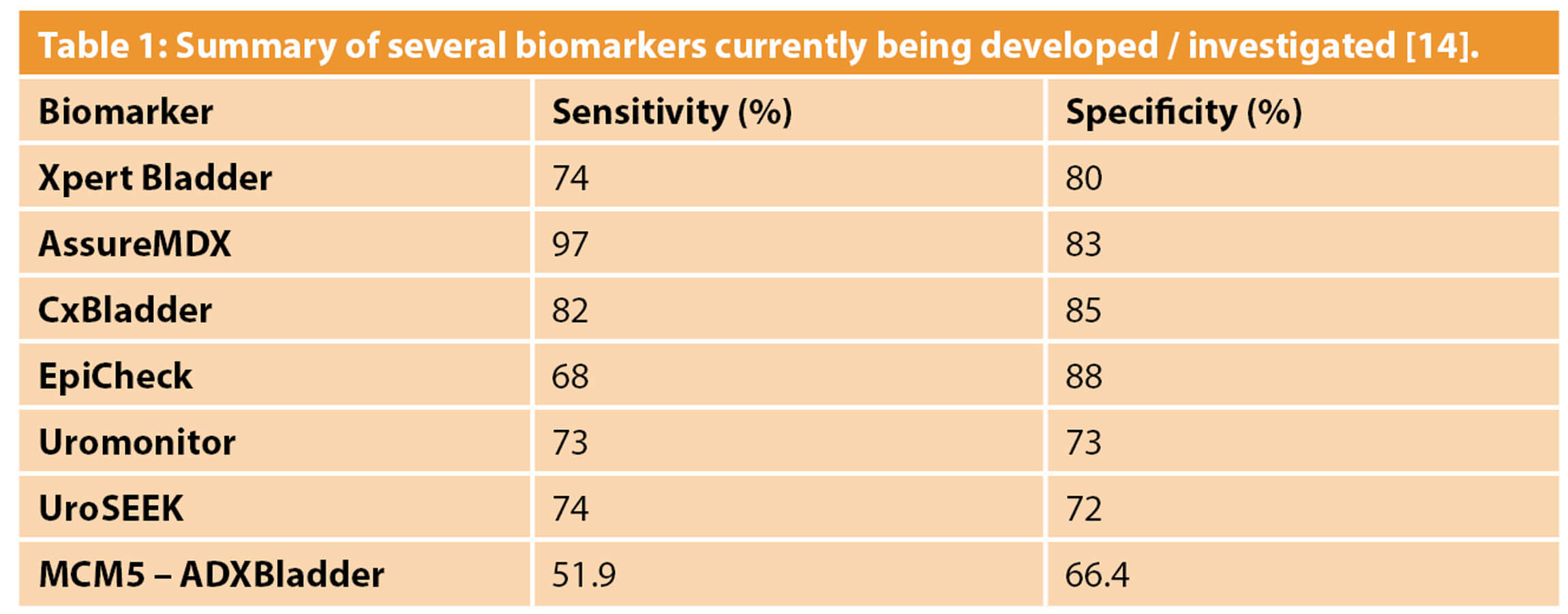 Whilst some molecular bladder cancer markers have greater sensitivity compared to urine cytology, they do not yet possess the accuracy and reliability to replace cystoscopy for diagnosis of bladder cancer. A possible role for urinary molecular markers lies in surveillance of patients with previous bladder cancer, in a hope to reduce the number of invasive cystoscopies. The burden of surveillance for NMIBC is high and negatively impacts patients’ quality of life [12]. Table 1 shows a summary of several biomarkers currently being investigated and developed. The DETECT I and DETECT II studies are aiming to prove that the UroMark assay can be used to rule out bladder cancer in patients with haematuria, and to assess whether the marker can be used to detect bladder cancer recurrence respectively [13].