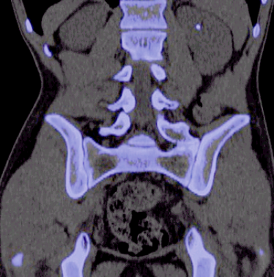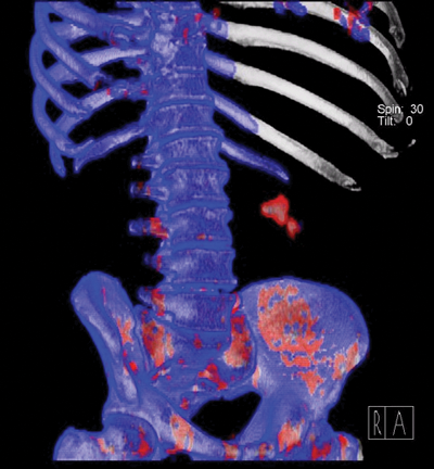 Recently, a new type of CT scanner has been more widely introduced - the dual energy CT. Two X-ray tubes are included in the CT scanner, which are used in a single scan acquisition. Images are acquired at twice the speed of a single energy scanner but the radiation dose is not increased. This can be better suited to patients who are unable to lie flat or hold their breath. The x-ray tube’s kilo voltage (kV) determines the average energy of photons in the x-ray beam. Changing the tube potential leads to an alteration of photon energy and a corresponding modification of the attenuation of the x-ray beam in the scanned material. In a dual-energy CT, two x-ray sources run simultaneously at different voltages, one at high-energy (140kV) and the other at lower energy (80kV), during a single image acquisition. Two data sets are therefore acquired which show different attenuation levels.
