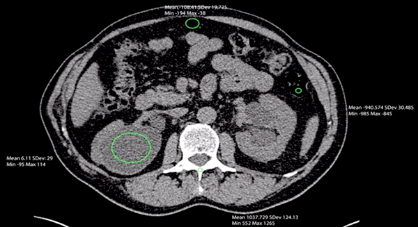 Figure 1: Unenhanced axial CT abdomen demonstrating the use of Hounsfield units.