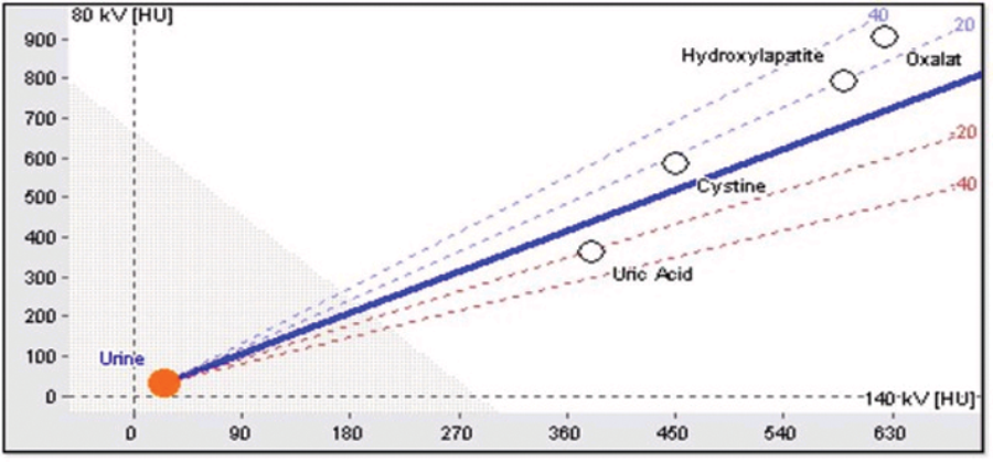 Figure 2: Graph used to ascertain stone composition using a dual-energy CT scanner.