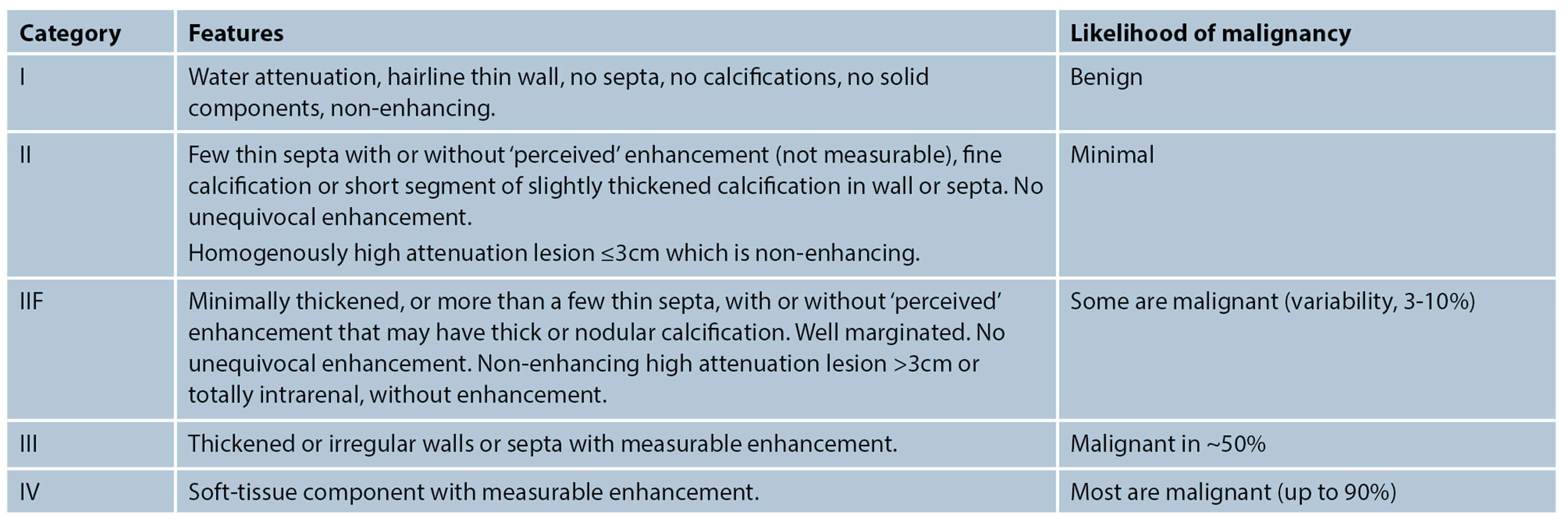 3. Bosniak classification of cystic renal masses. A new updated Bosniak classification was proposed in 2019 with the purpose of including MRI features and to increase accuracy. However, it is still awaiting widespread validation [2-4].