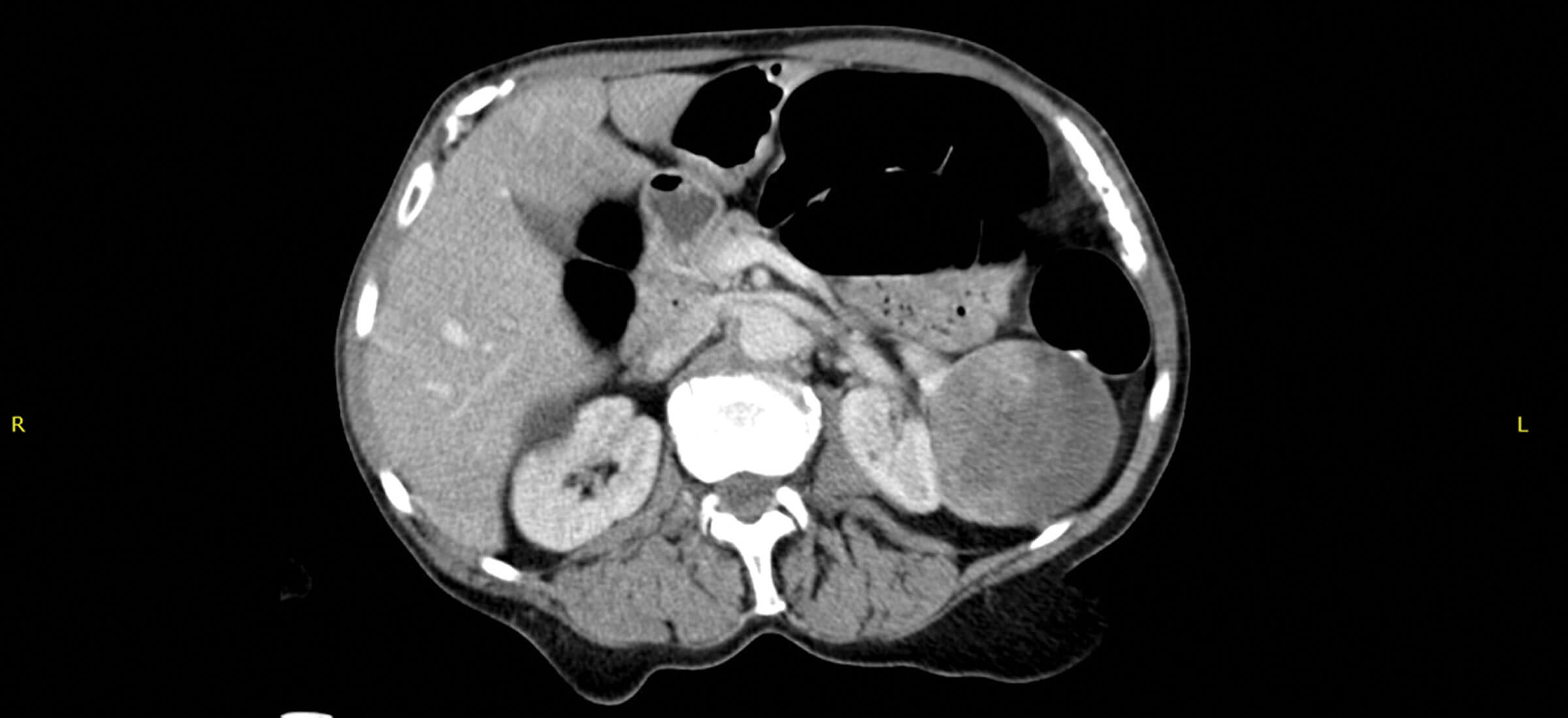 A 70-year-old female presented under the medical team with malaise, weight loss, and deranged liver function tests (LFTs) and calcium (ALP 350, GGT 650, Serum bilirubin 29, normal aminotransferases, Ca 3.3). An abdominal ultrasound scan (USS) was performed which demonstrated hepatosplenomegaly and an incidental finding in the kidney. A CT was arranged (Figure 1).