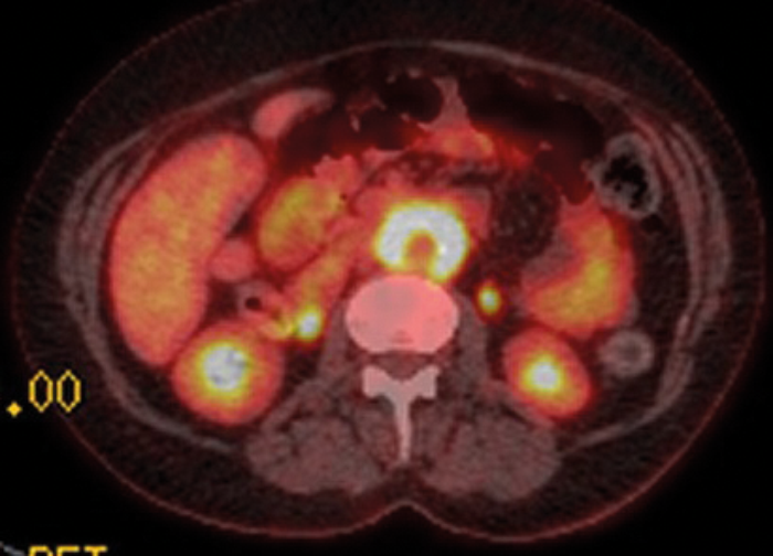 Figure 5: Axial fused PET-CT shows extensive uptake and metabolic activity encasing the aorta.